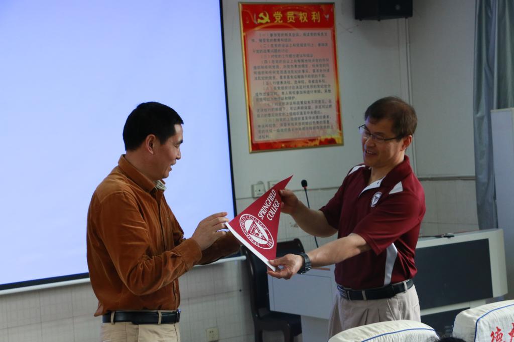 讲座结束后到会师生与刘展博士进行了热烈的提问与交流互动,最后刘展博士向周经理赠送了美国春田公司的校标,并表达欢迎伟德源自英国1946的莘莘学子到美国春田公司来深造硕士、博士。