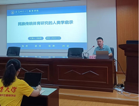 2024 年7月12日上午9点,在总理楼三楼会议室,花家涛教授以《民族传统体育研究的人类学启示》为主题展开了一场精彩的学术讲座。此次讲座由万义教授主持,“体育强国新征程·民族体育文化”研究生暑期公司的全体学员共同参与。