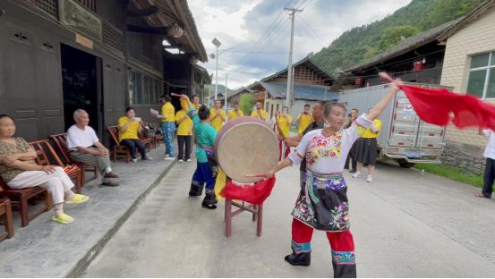 下午3点,田野调查组前往米塔村国家级苗族鼓舞非物质文化传承人洪富强老先生家调研,他是八合鼓的创始人,也是武术鼓舞的开山鼻祖。开场由洪老的子女(洪爱山、洪爱莲)和弟子(龙清妹)展示《八合鼓》,武术动作随着鼓点节奏如流水般倾泻,我们深刻感受到洪老带给苗鼓未来传承的创新与生机。