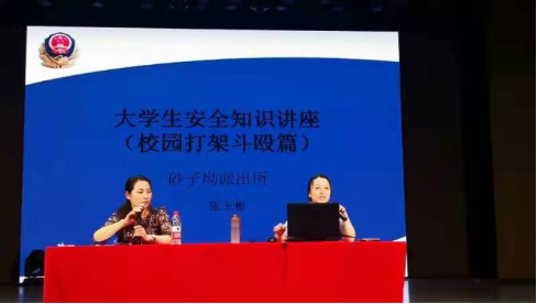 民警张玉彬通过现场情景的演绎、真实案情的讲述,生动幽默的为同学们阐述了打架斗殴事件的“基础套餐“、”轻微伤套餐“以及”重伤套餐”。她希望同学们能常敲警钟,用微笑解决一切矛盾。