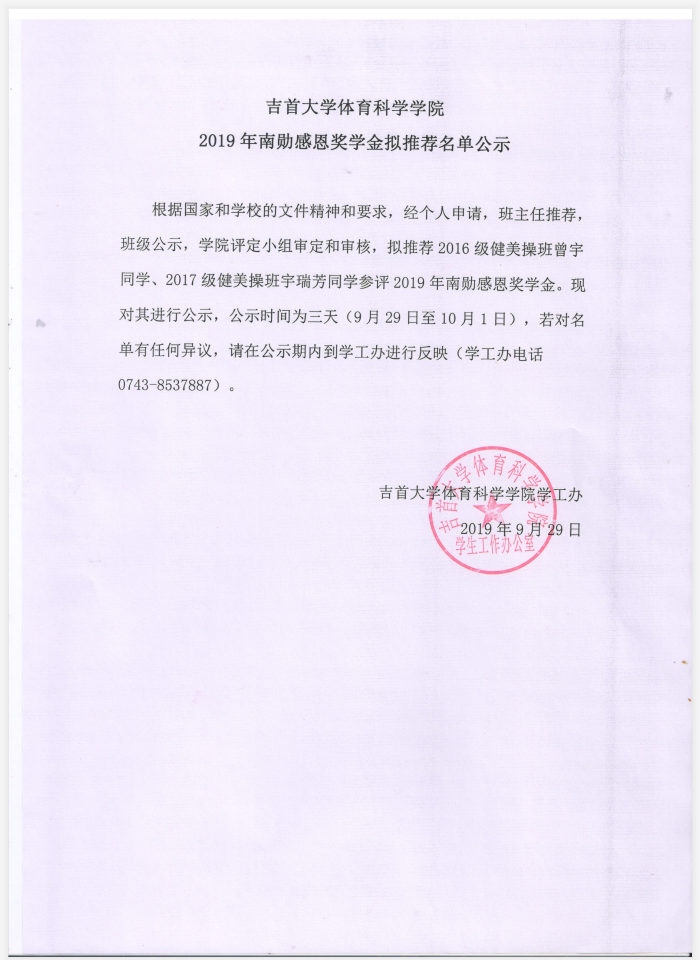 bevictor伟德2019年南勋感恩奖学金拟推荐名单公示