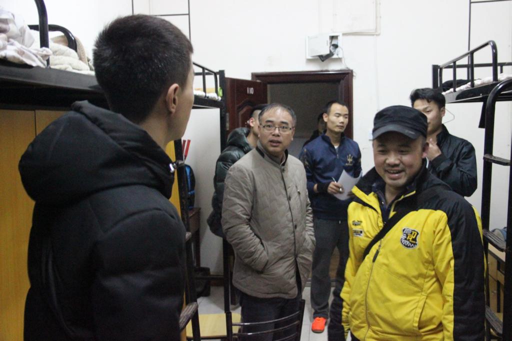 图为 吴永海书记和彭友辅导员下寝视察 在这次检查中,吴永海书记下访了男生寝室,针对一些取暖电器等设备有问题的寝室,他指出在宿舍要注意用电安全,不要用小太阳这类大功率的电器。寝室的卫生不到位,指出寝室的乱挂,乱扔的现象,要求同学们好好维持日常的宿舍洁净。并提醒同学们要注意身体,期末将近,同学们抓紧时间复习。 就此次检查而言,总体是好的,大多数宿舍清洁干净。