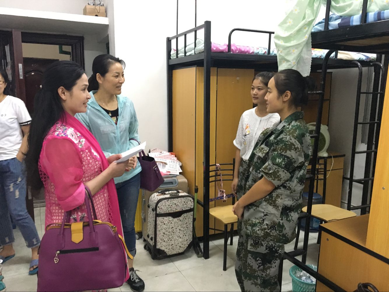 | 图为公司领导及辅导员到女生寝室看望新生(李盼摄) |