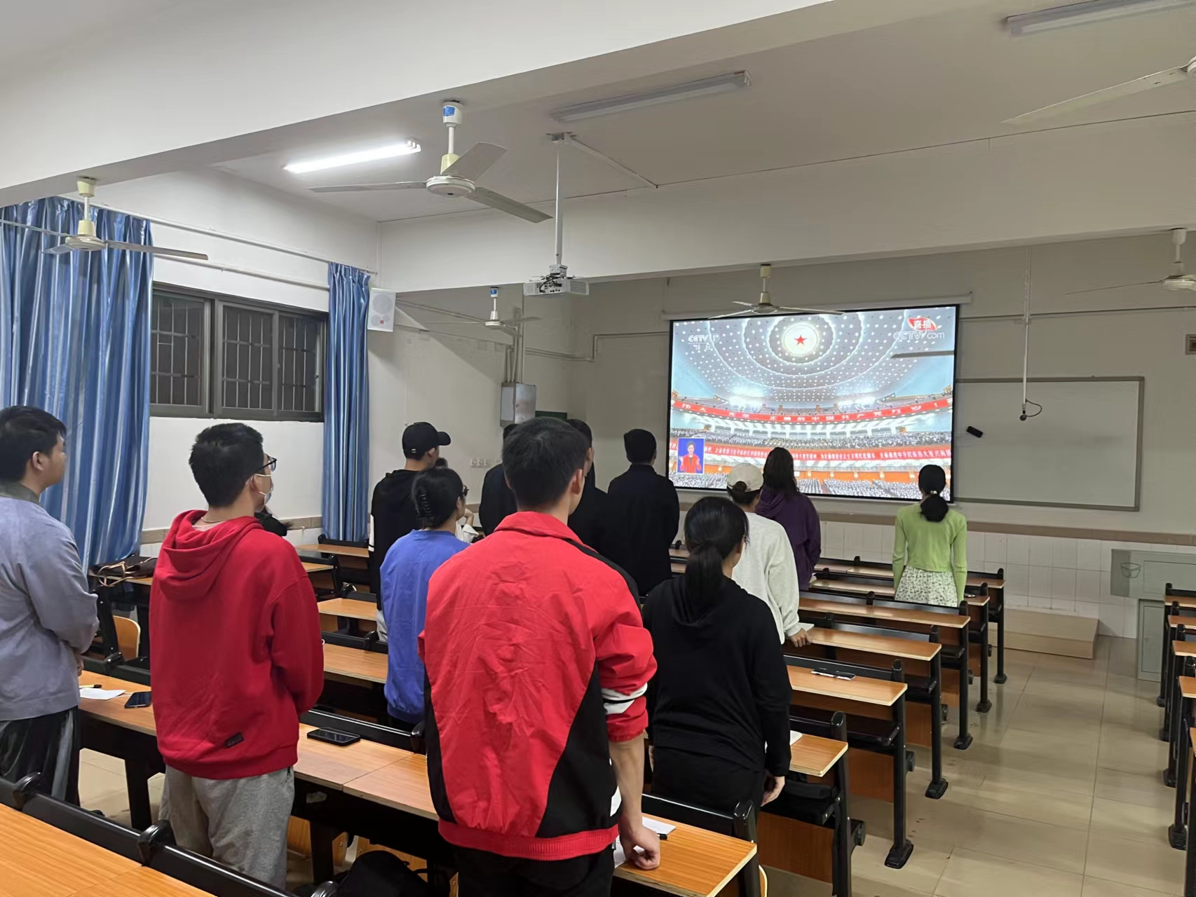 上图为 研究生、本科生员工集中观看党的二十大开幕会的现场