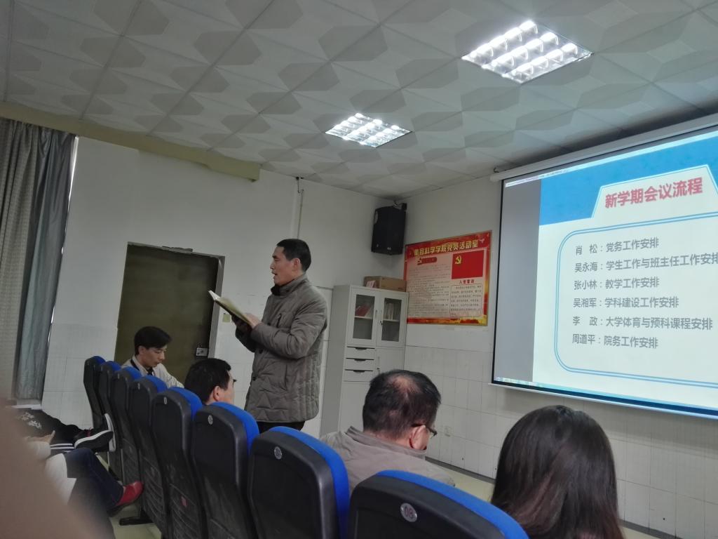肖松书记传达部署2018年公司党务工作安排和公司党委民主生活会工作。他提出了新学期认真学习贯彻党的十九大报告精神和党风廉政建设等工作。要求全院教师强化主体责任和监督意识,树立纪律意识,牢牢守住底线,狠抓落实,确保工作成效。