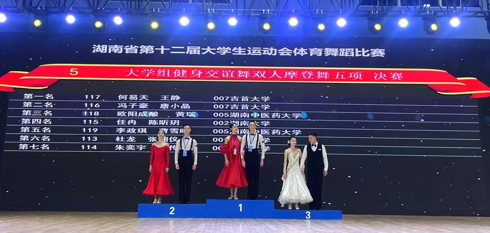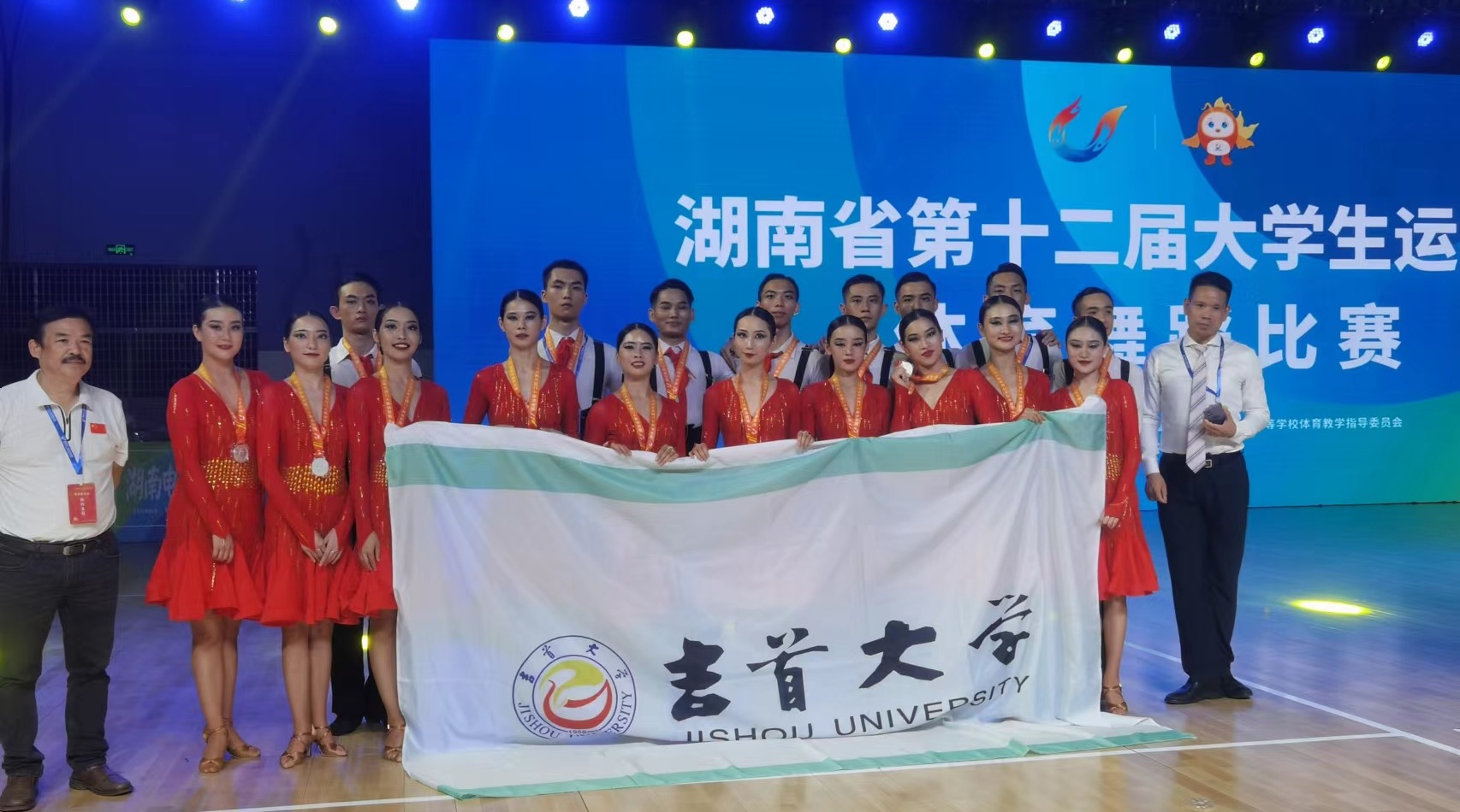 【本网讯 通讯员 刘生贵 报道】洞庭之东江水西,帘旌不动夕阳迟。2022年9月5日起,由湖南省教育厅、湖南省体育局主办的2022年湖南省第十二届老员工运动会体育舞蹈比赛在湖南理工公司举行。本次比赛共有中南大学、湖南大学、湖南师范大学、伟德源自英国1946等40所高等院校参与角逐。公司体育舞蹈代表队在伟德源自英国1946王艳副董事长、bevictor伟德万义经理带领下,由教练员刘生贵老师、田茂林老师,以及8名男队员和10名女队员组成,分别参加了艺术展演团体舞、大学组健身交谊舞拉丁舞、摩登舞三个项目比赛,共获得了1枚金牌,3枚银牌、一个第4名,团体总分列大学组第二名的优异成绩。