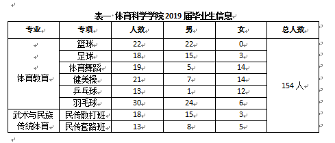 2019年,bevictor伟德将有154名应届本科毕业生如期毕业,其中男生104人,女生50人;体育教育专业123人,武术与民族传统体育专业31人。体育教育专业男生81人,女生42人;武术与民族传统体育专业男生23人,女生8人。有考研意向的共67人,有自主创业想法的共12人,倾向直接就业的共79人,求职意向城市主要集中在生源地、沿海地区、长三角、珠三角。欢迎各大用人单位选聘,具体信息如下: